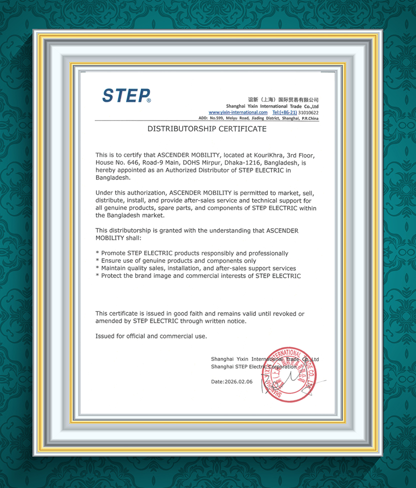 ASCENDER MOBILITY has been officially appointed as the Authorized Distributor of STEP ELECTRIC in Bangladesh, as certified by Shanghai STEP Electric Corporation Ltd., through its international trade arm Yixin International Trade Co., Ltd. (Shanghai, China).